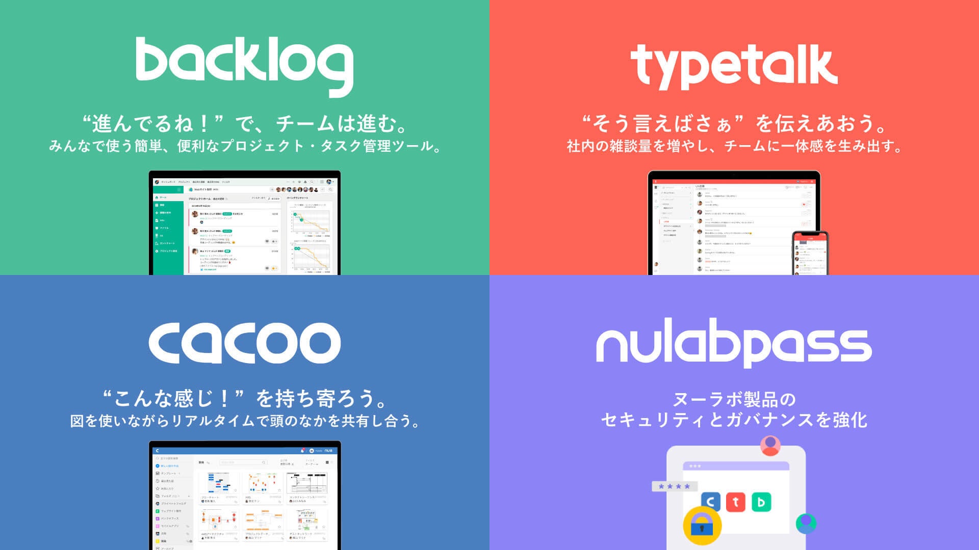 ヌーラボは、プロジェクト管理・タスク管理ツール「Backlog」、オンライン作図ツール「Cacoo」、ビジネスチャットツール「Typetalk」、組織の情報セキュリティ・ガバナンスを高めるための「Nulab Pass」を開発・提供しています。