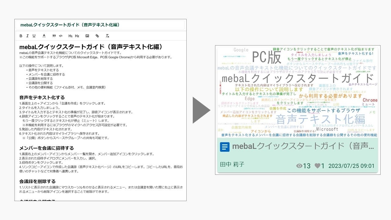 mebaL(https://mebal.jp/)は、個人の業務ノウハウやアイディアを組織内に蓄積・共有するためのナレッジ共有クラウドサービスです。社内の「あの人にしかわからない」という状況をなくし、誰もがいつでも得たい情報へ簡単にアクセスできる環境を実現することで、業務効率の最大化をサポートします。