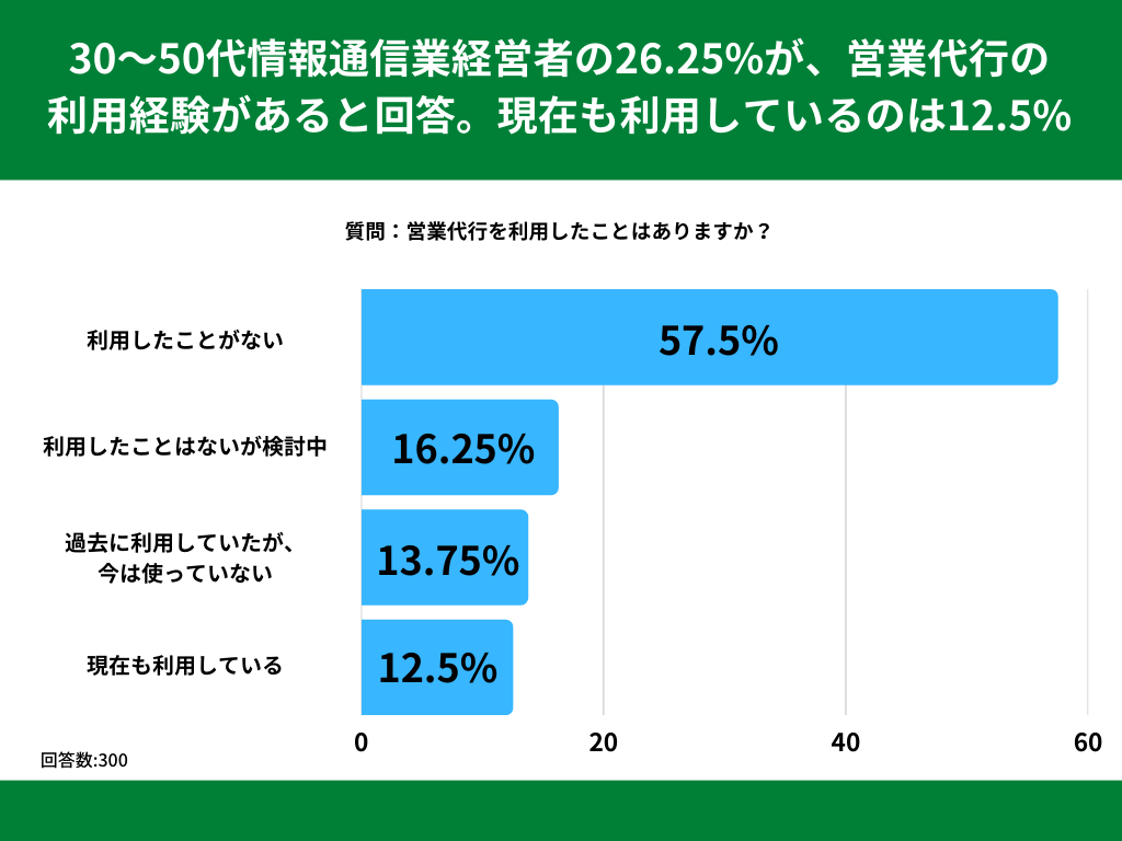 30代〜50代の男女を対象とした「営業代行を利用したことはありますか?」というアンケートで最も多かった回答は「利用したことがない」で57.5%でした。