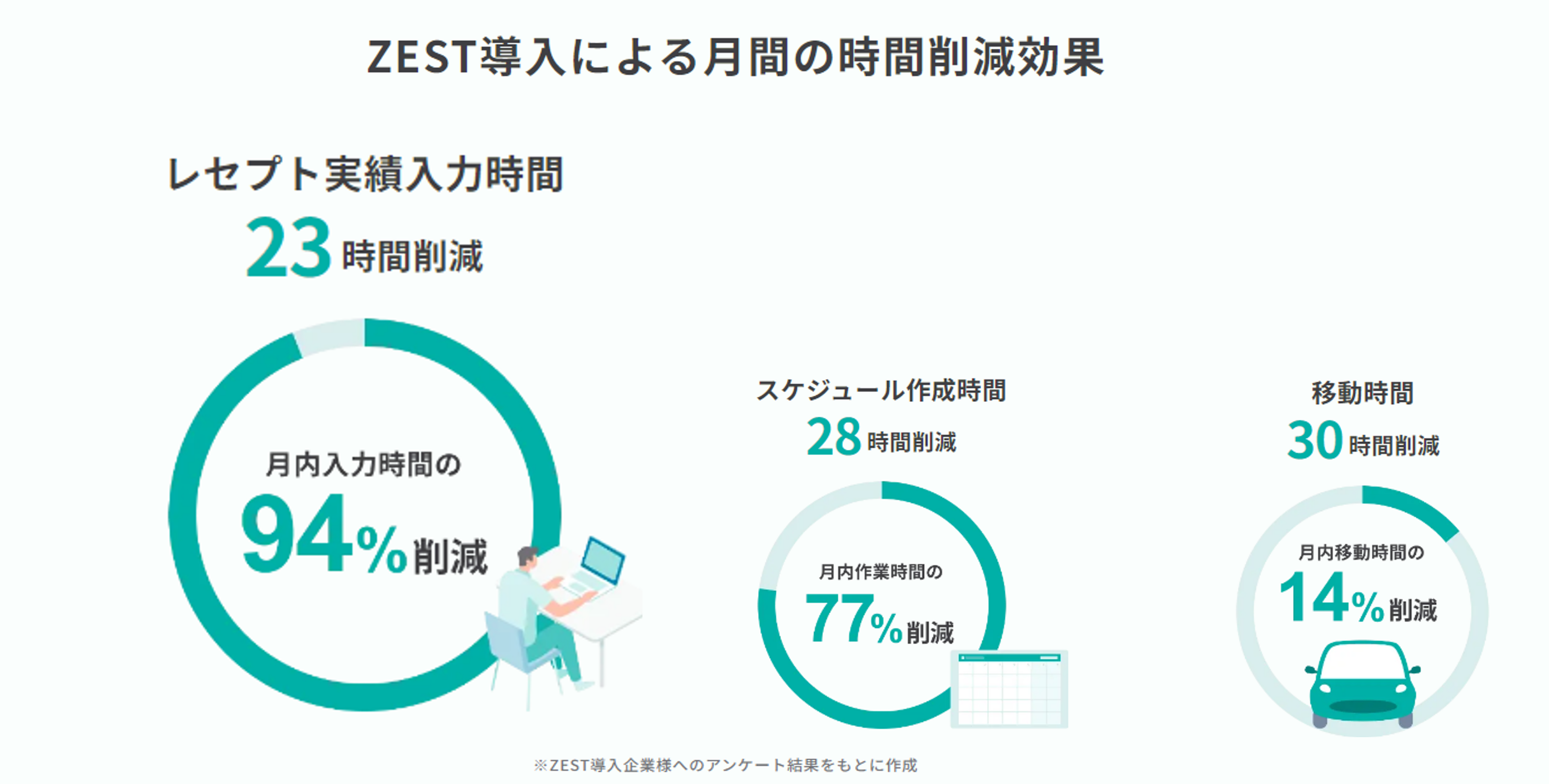 ZESTのお客様であり、かつカイポケユーザー様への実態調査を行ったところ、レセプト業務における実績入力作業は、ZEST導入前で平均24時間もかかっていました。ZEST導入後は平均1時間に短縮、約94%の削減を実現し、23時間もの時間を創出することができたという調査結果を得ることができております。