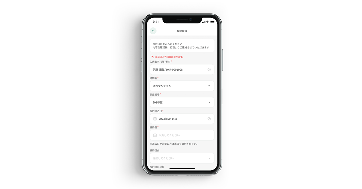 「GMO賃貸DX 入居者アプリ」から入居者様が解約申請ボタンから申請を行うことで、管理会社様の管理画面へ通知されます。