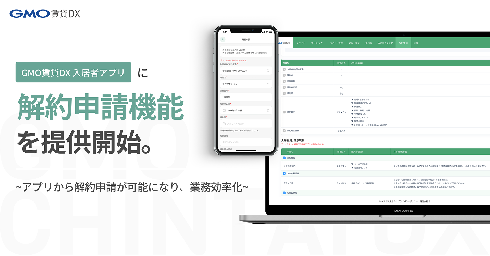 そのため、登録の際から利用している「GMO賃貸DX 入居者アプリ」で解約の申請もできるようにすることで、入居者様にとってもわかりやすく、不動産管理会社様は問い合わせに対する手間を省くことができるように、『解約申請機能』を提供開始することとしました。