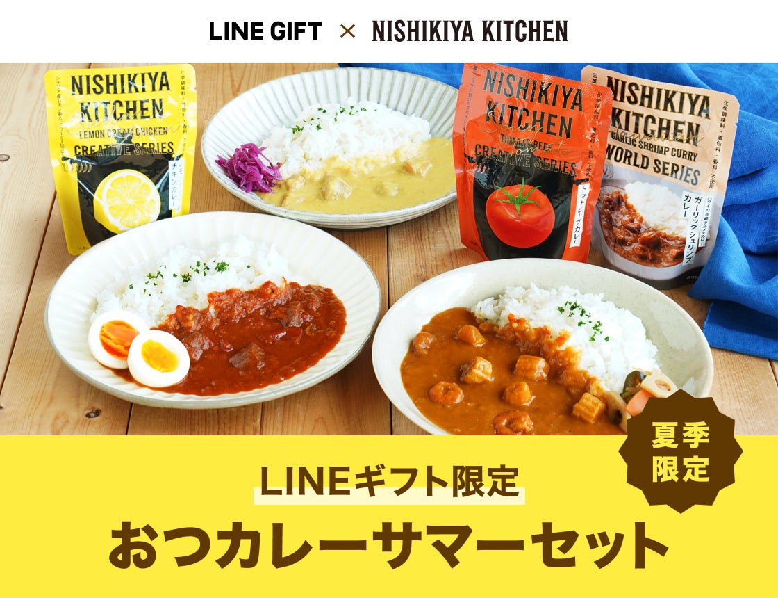サマーギフト特集(https://u.lin.ee/wWUiVLS )に掲載中の「ニシキヤキッチン」とのコラボ商品『おつカレーサマーセット』は、LINEギフト限定商品です。人気カレー3種の限定セットで、今年も暑い夏・節電の夏が予想される中、常温で長期保存できるレトルト食品は夏ギフトとしても需要が高く、夏にぴったりなギフトとなっています。