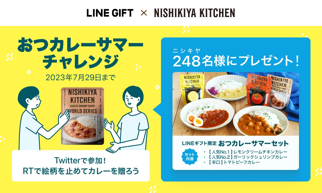 LINEギフト公式Twitterアカウントをフォローし、「おつカレーサマーチャレンジ」のキャンペーン投稿をリツイートして動くイラストを止めると、リプライでチャレンジ結果が届きます。ニシキヤキッチンのカレーを贈れていたら大当たり!合計248(ニシキヤ)名に、『おつカレーサマーセット』を進呈します。