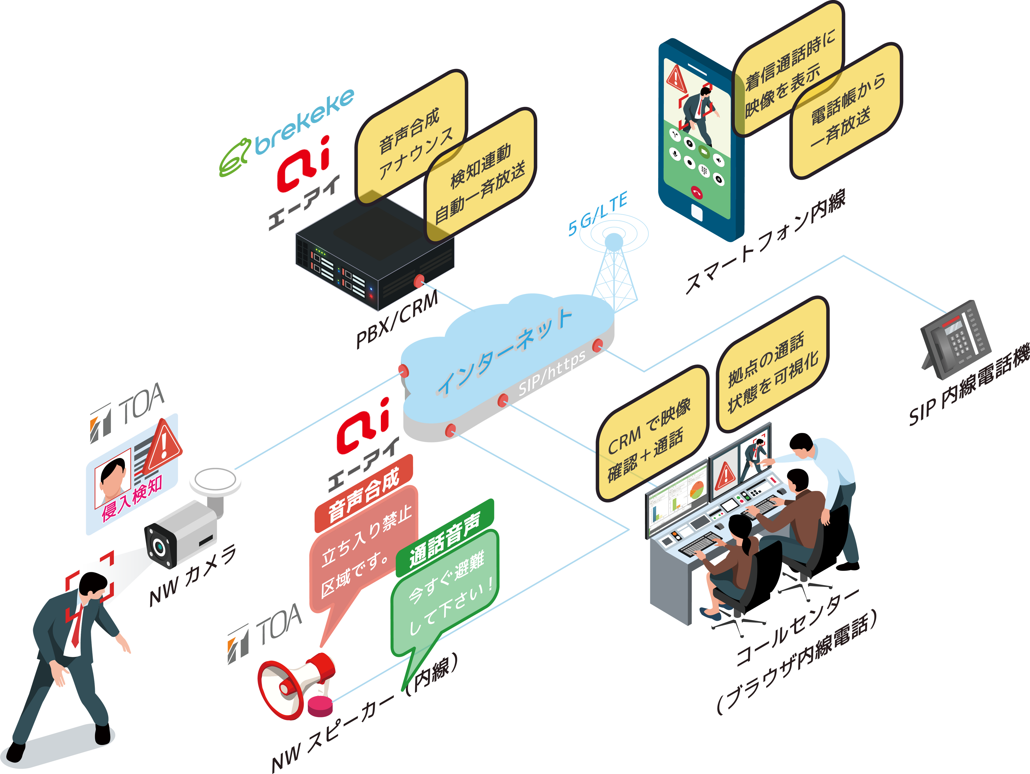 日本ブレケケが提供するBrekeke PBXにエーアイの音声合成を連携させ、TOAの提供するSIP対応IPスピーカー(IPオーディオシリーズ)から、音声情報を一斉通知または特定箇所にのみ通知など、通知先を制御して音声放送を行うことができます。さらにTOAの提供する防犯カメラ(TRIFORAシリーズ)と連携することで、滞在者数や人数カウントの検知をきっかけに、スマートフォンアプリ(Brekeke Phone)、またはコールセンター製品(WEBブラウザPhone)を使用した現地映像の確認と拡声放送、エーアイが提供する音声合成による自動放送が可能となります。