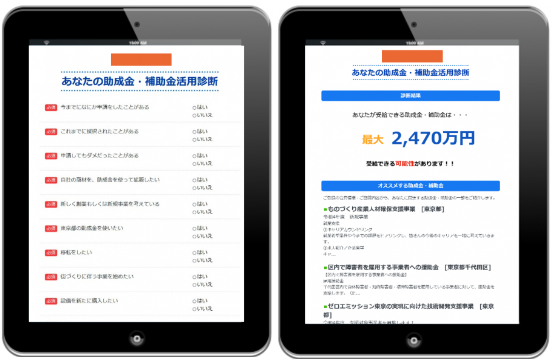「活用診断OEM」とは、アンケートに回答するだけで、最適な助成金・補助金を自動診断するシステムです。
