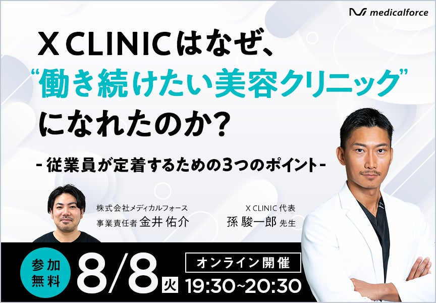 そこで今回は、2020年の開業後、「働き続けたいクリニック」として評判を呼び、わずか3年で80名以上のスタッフを抱える、XCLINIC代表・孫駿一郎先生をゲストにお迎えし、「スタッフに愛されるクリニック作り」について採用・育成・環境作りといった観点からご紹介いたします。