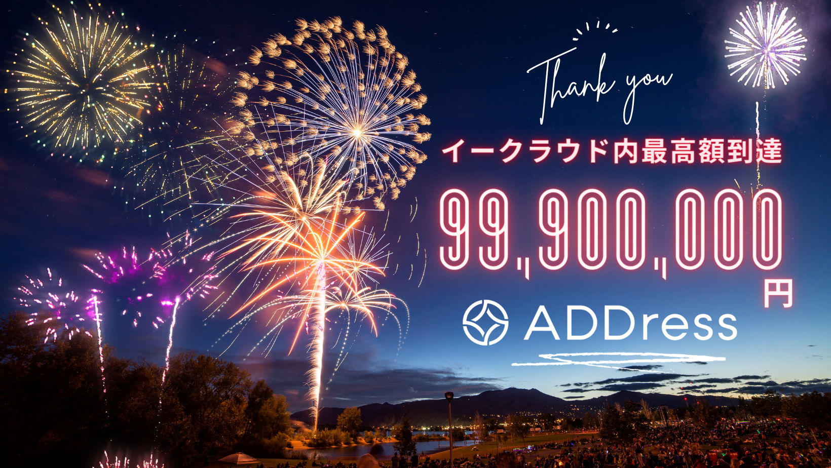 ADDressへの申込額が9,990万円に到達したことで、株式投資型クラウドファンディングの国内最高額を更新し、イ―クラウド内のこれまでの最高額(6,417万円)も大幅に上回りました。加えて、申込み受付の開始後、約46分で目標募集額の3,000万円に到達しており、イークラウド内でのこれまでの目標募集額の最短到達記録(約75分で980万円)を更新しました。