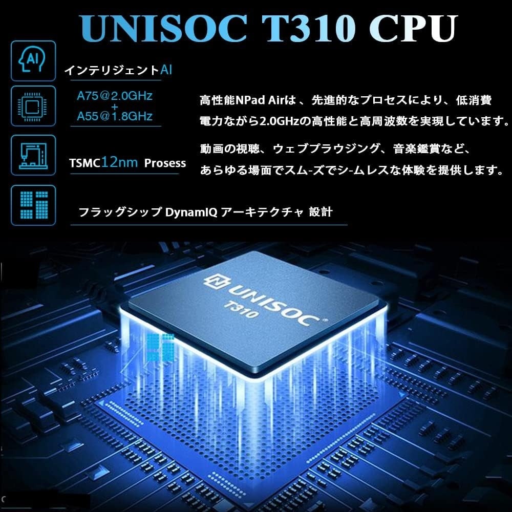 Npad Air Android12 タブレットはUnisocに開発された4コアCPU「CPU T310 」は低消費電力で製造され、PVR GE8300グラフィックスプロセッサを合わせ、低消費電力と低発熱を実現でき、様々な機能が強化されており、より軽快な動作と高速な処理が可能になります。動画の視聴、ウェブプラウジング、音楽鑑賞などに最適です。