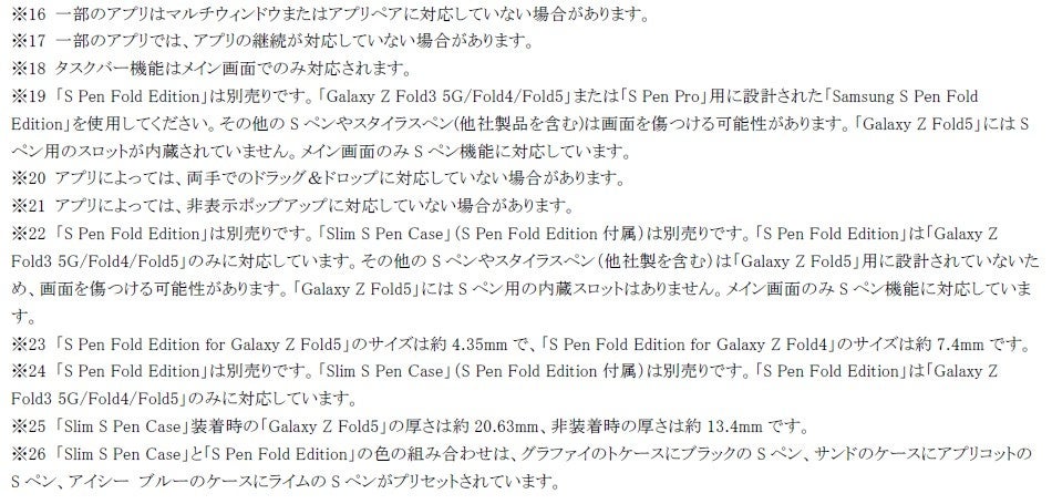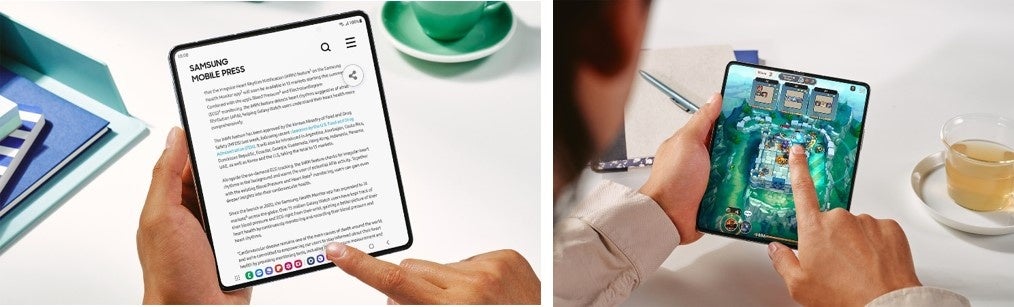Galaxy Z Foldシリーズは、マルチウィンドウ※16や端末を開いても閉じても同一アプリの使用を継続できるアプリの継続性※17、タスクバー※18、ドラッグ&ドロップ、サードパーティ製アプリの最適化など、幅広い機能を備えており、大画面での体験を通じて日常の生産性を変革するパイオニアです。さらに、「Galaxy Z Fold3 5G」で導入された「S Pen Fold Edition」※19も、「Galaxy Z Fold5」で優れた筆記体験を提供するために再調整されています。これらの機能とツールが一体となり、大画面でパワフルな生産性を実現し、ユーザーはどこからでも重要なタスクをこなすことができるようになります。
