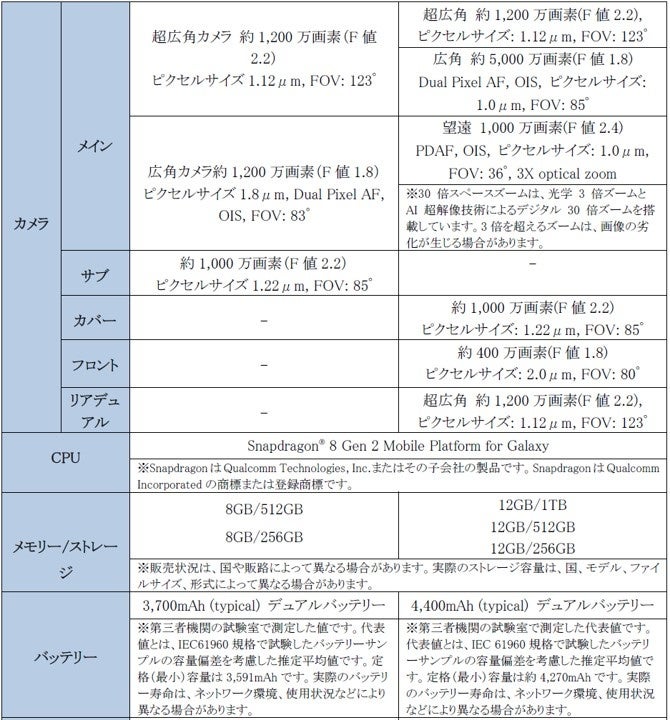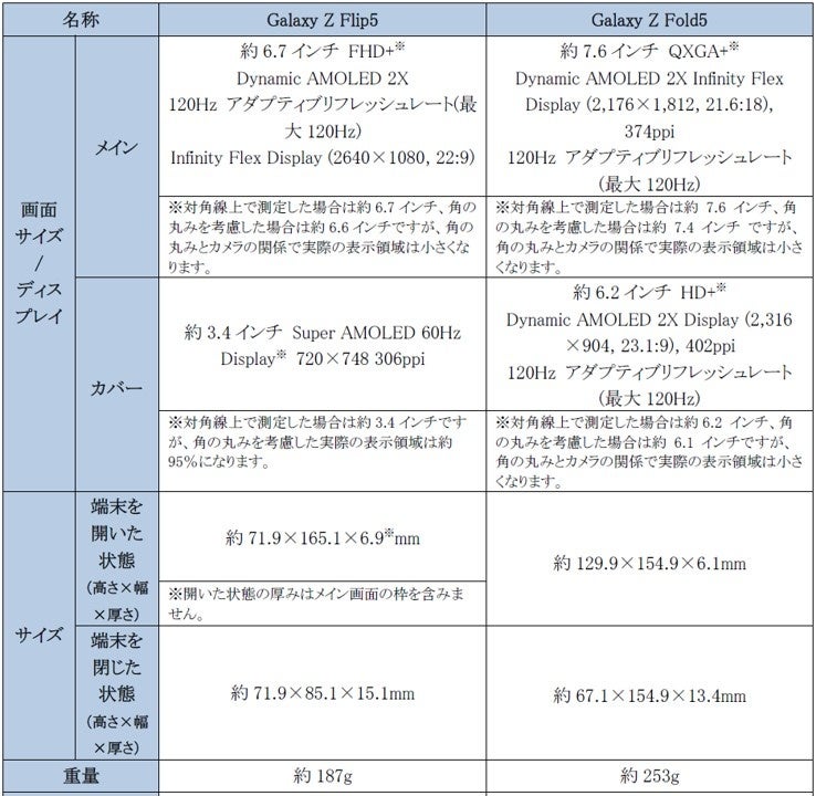 <主な仕様:「Galaxy Z Flip5」および「Galaxy Z Fold5」>
