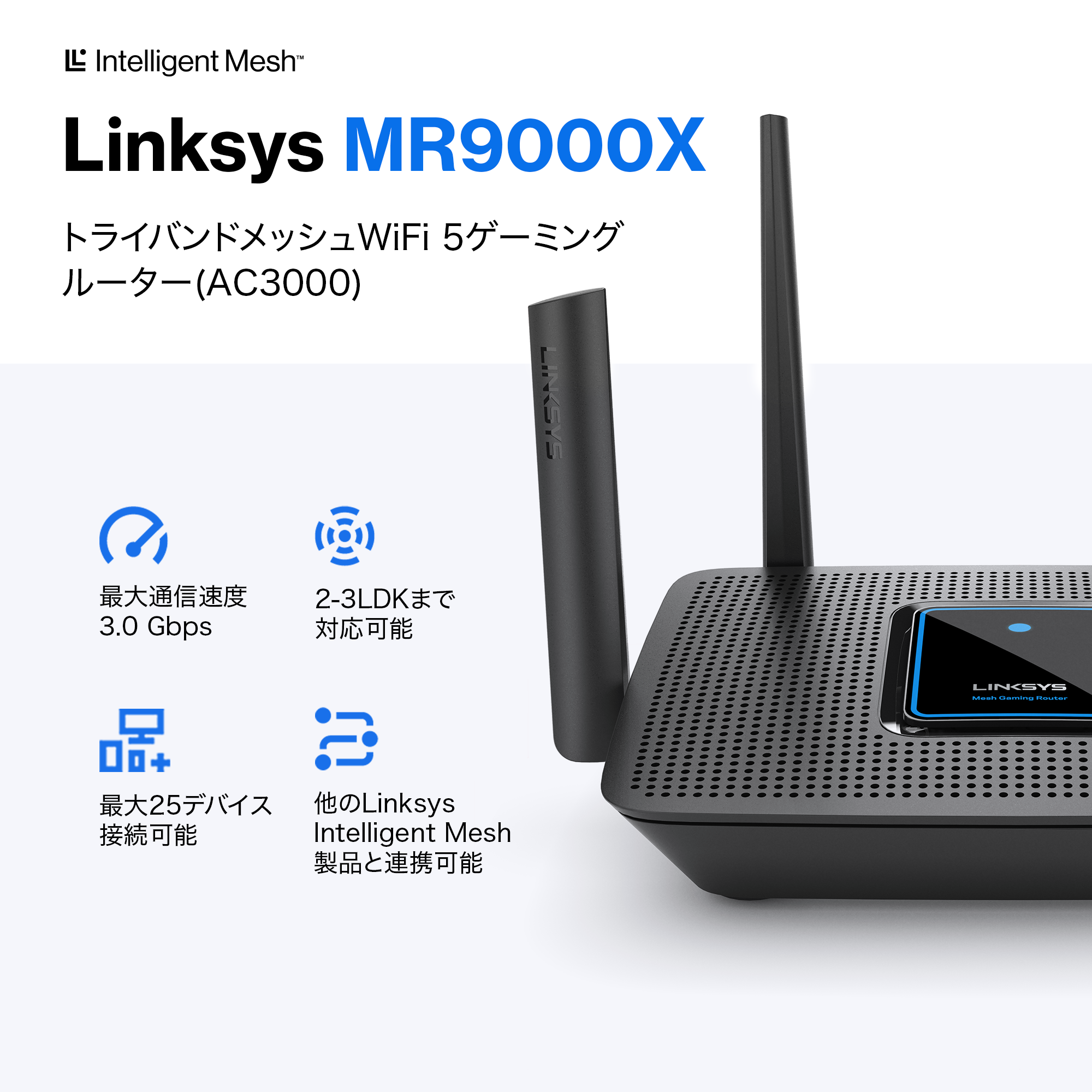 Intelligent Meshテクノロジー – ゲーミングルーターながら、LinksysのIntelligent Meshにもしっかり対応。ノードを追加するだけで、通信可能範囲をご自宅全体に広げたり、電波の強度を高めたりできます。さらに、MR9000Xは親ノードとしても子ノードとしても使えるので、WiFiネットワークの強化が必要になった場合も柔軟に活用できます。