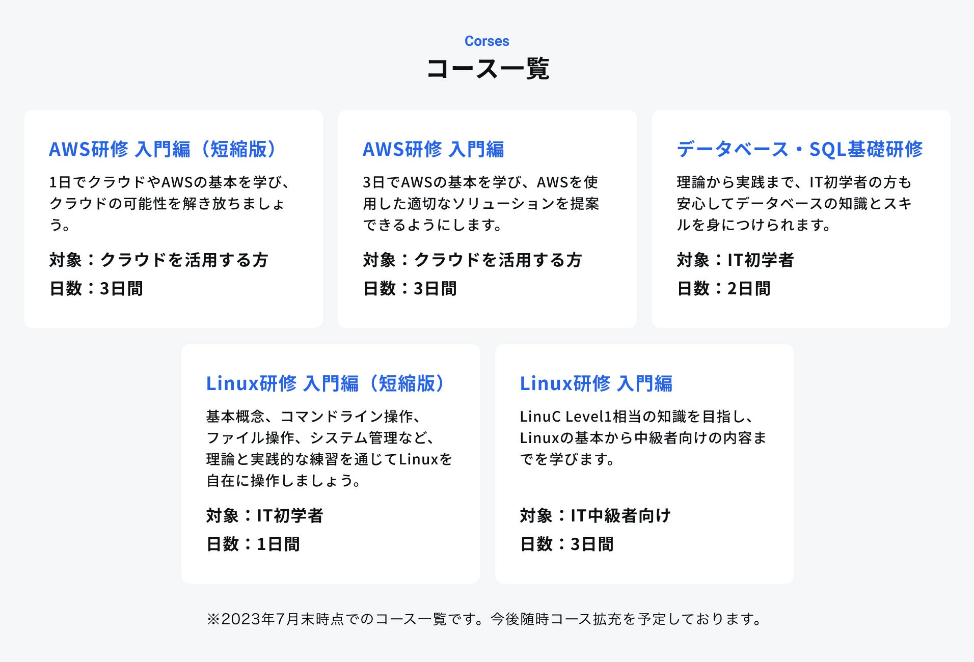 これまでは、データベース・Linux・クラウド分野(AWS)といったインフラ周りを中心とした研修コースを提供してきましたが、今後は、インフラ周りの研修にくわえ、プログラミング関連の研修コースも提供してまいります。特にJavaやPythonといった言語にフォーカスし、現代のシステム開発に必要なスキル習得をサポートいたします。また、非エンジニア向けの研修(IT及びセキュリティリテラシー研修、ChatGPTに関する研修等)も今後検討してまいります。