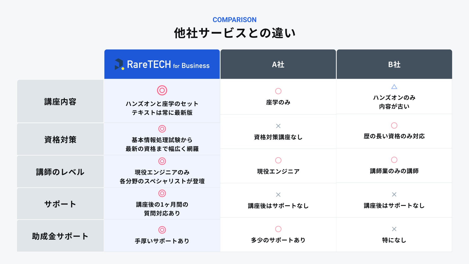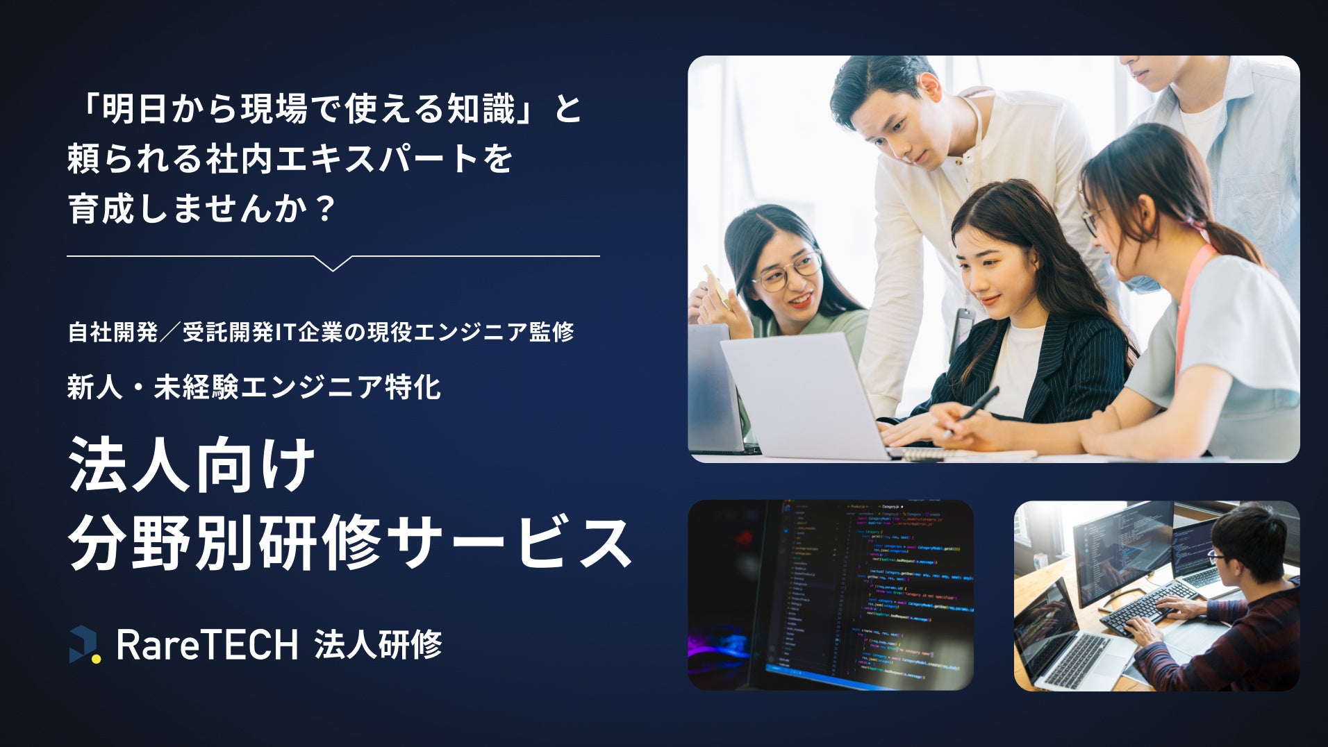 そこで弊社は、この問題に対処すべく、エンジニア育成経験と自社開発のノウハウを持つ優れた講師陣とカリキュラム開発チームによる協力体制を整え、すでに個人向けとして提供している「RareTECH」の法人向けサービスの提供を開始。