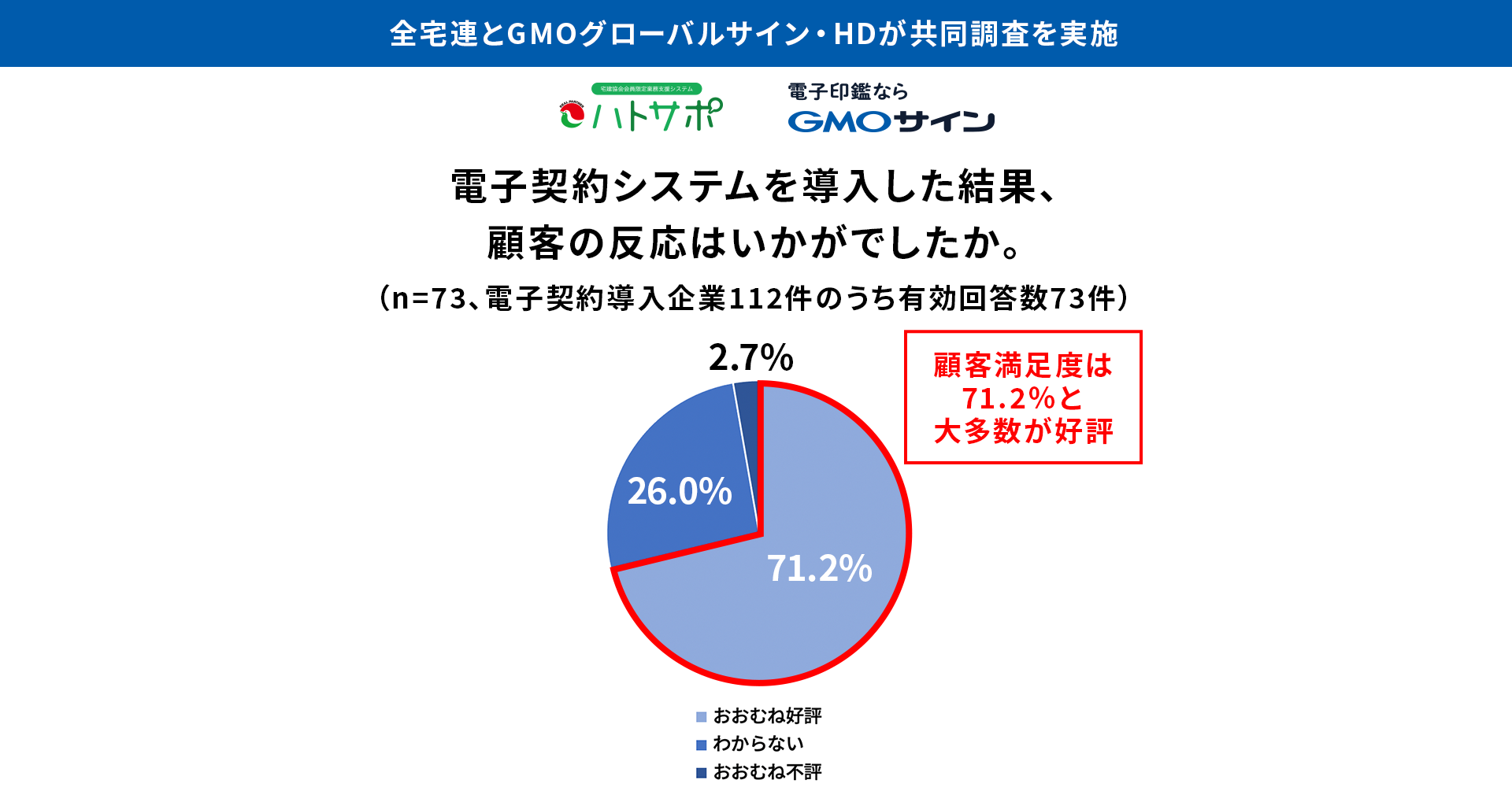 ①実際に電子契約を実施した場合の顧客満足度は7割超と、大多数が好評だった。
