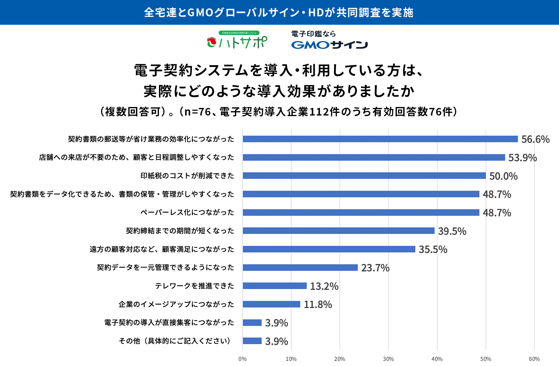 電子契約システムの導入効果として、「契約書等の書類送付の省力化および業務効率化が実現」(56.6%)、「顧客との日程調整が容易になる」(53.9%)、「印紙税コスト削減」(50.0%)、「書類保管・管理が容易になる」「ペーパーレス化の実現」(48.7%)など、導入企業の多くで業務効率化・省力化や経費削減といった定量的な効果の発現に寄与していました。