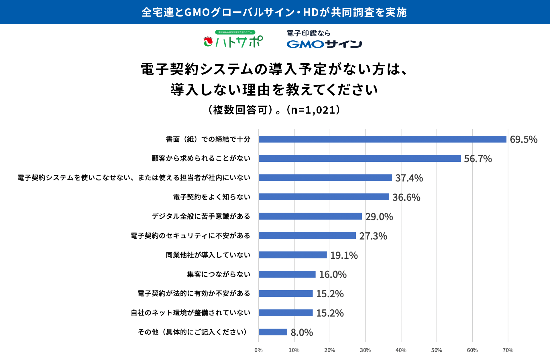 現在、電子契約システムを導入していない企業の理由として、導入未定企業の69.5%が「紙の契約締結で十分」と回答し、56.7%が「顧客からのニーズがない」と回答しました。これにより、顧客側でまだ電子契約が一般化していない現状がわかります。さらに、企業側では、「電子契約システムを使いこなせる担当者の不在」が37.4%、「電子契約をよく知らない」が36.6%、「デジタル化への苦手意識」が29.0%、「電子契約のセキュリティへの不安」が27.3%といったデジタル化に関する懸念が存在していることがわかりました。