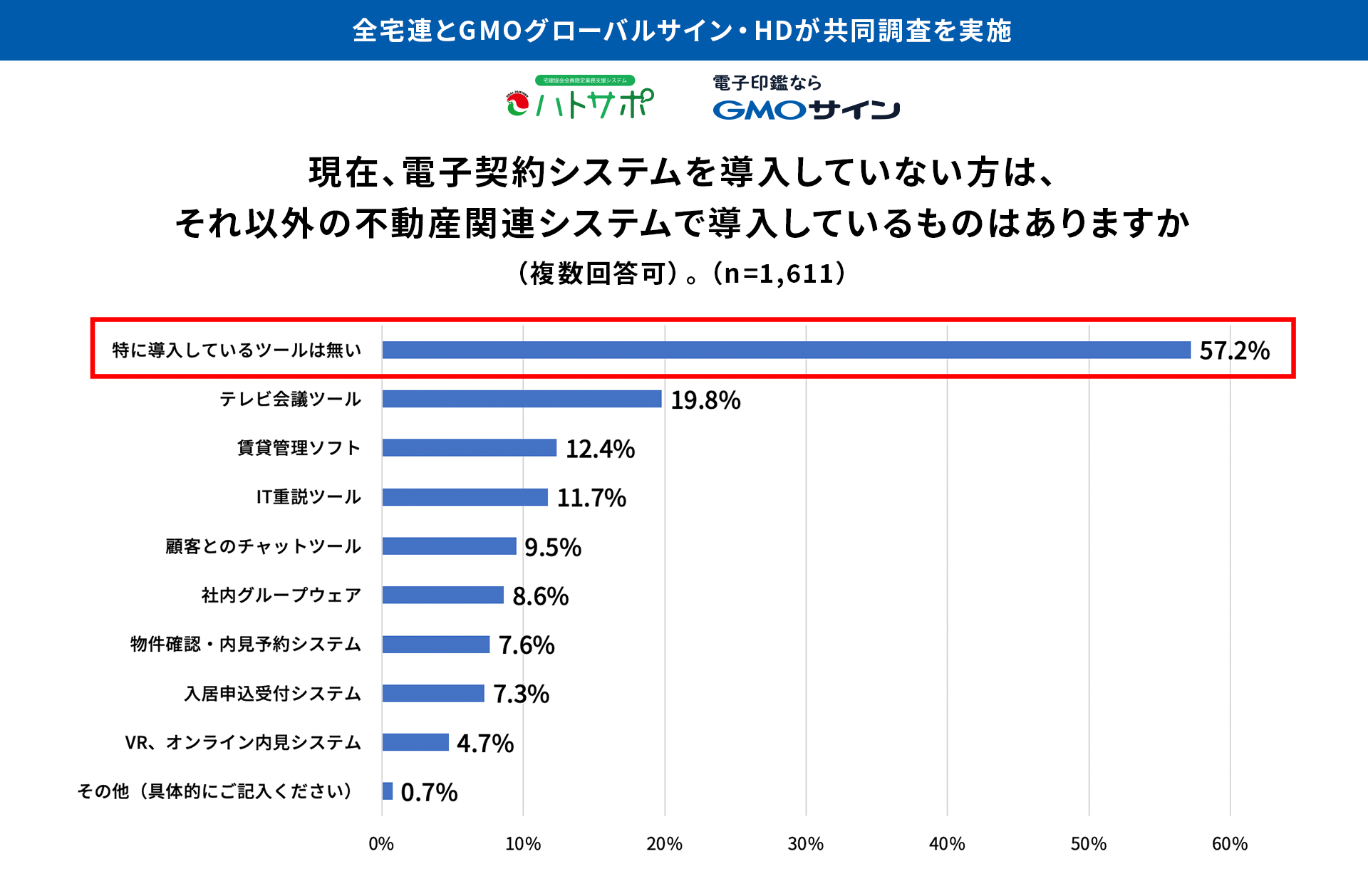 不動産業務に関連するツールやシステムの導入状況を見ると、「テレビ会議システム」が19.8%と最も多い結果となりました。しかし、「特にツールを導入していない」と回答した割合が57.2%となり、過半数の企業で不動産DXが進展していないことを示しています。