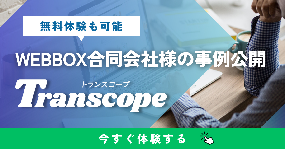 無料プランもございますので、まずは無料プランからTranscope(トランスコープ)をお試しいただくことも可能です。