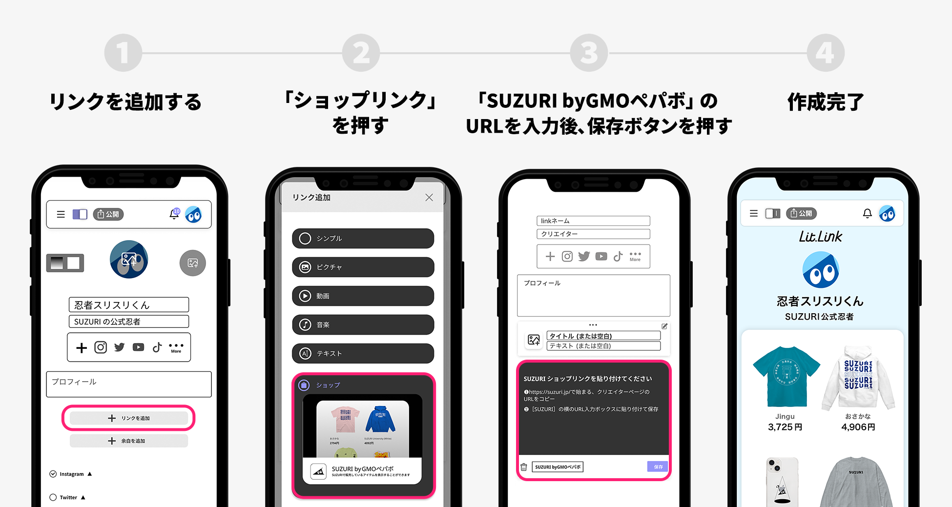 今回の連携に基づき、本日2023年7月27日(木)より提供開始した「lit.link」のショップリンク機能の第1弾として「SUZURI byGMOペパボ」が採用されました。これまでボタンのみでの表示となっていた「lit.link」から「SUZURI byGMOペパボ」への動線が、よりビジュアルリッチな表示となることで、クリエイターはより多くのファンを自身のショップおよび販売アイテムへ集めることが可能となります。「lit.link」の機能については、今回追加したショップリンク機能を含め、すべて無料でご利用いただけます。