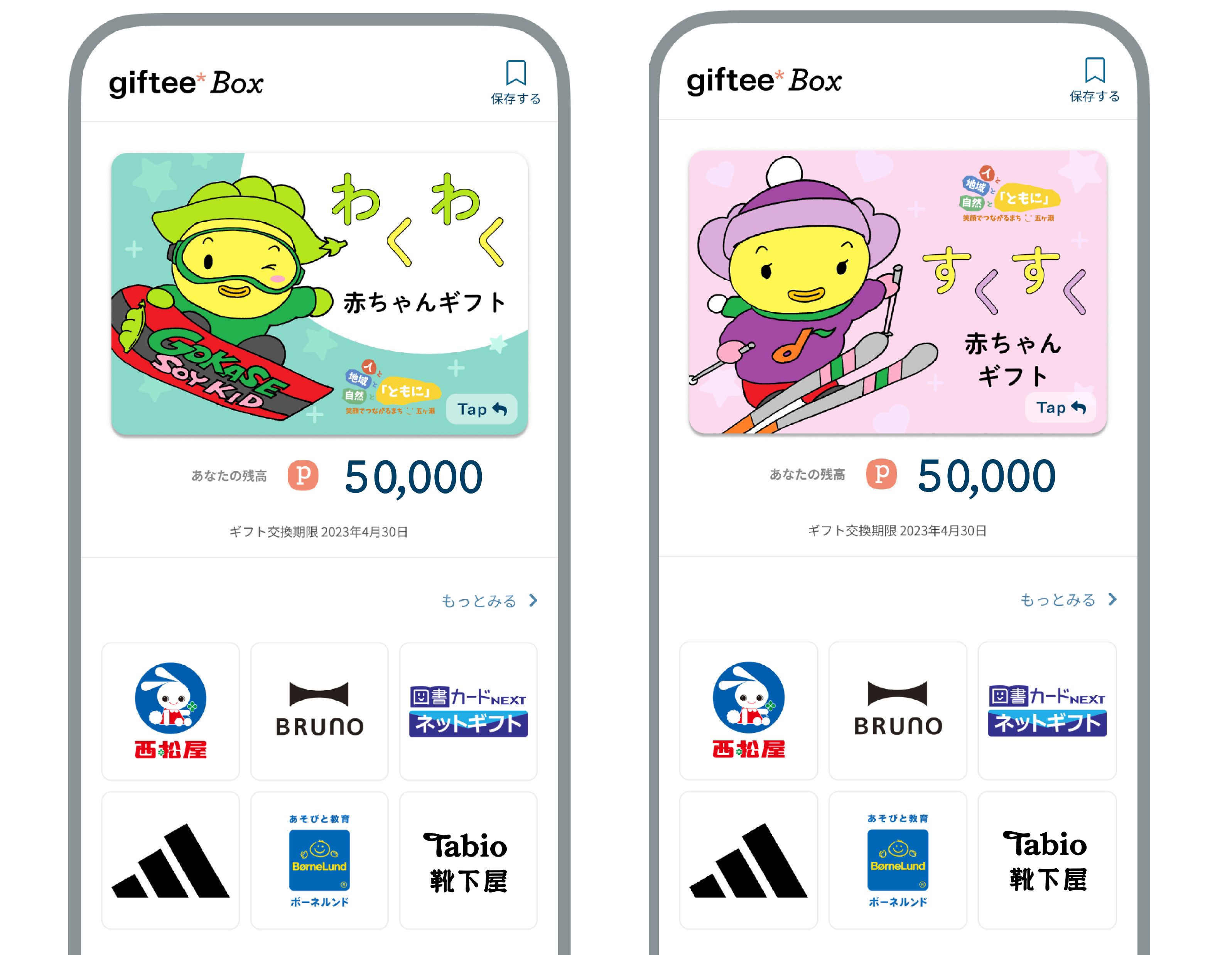 デジタルギフトボックス「わくわく赤ちゃんギフト」「すくすく赤ちゃんギフト」画面イメージ