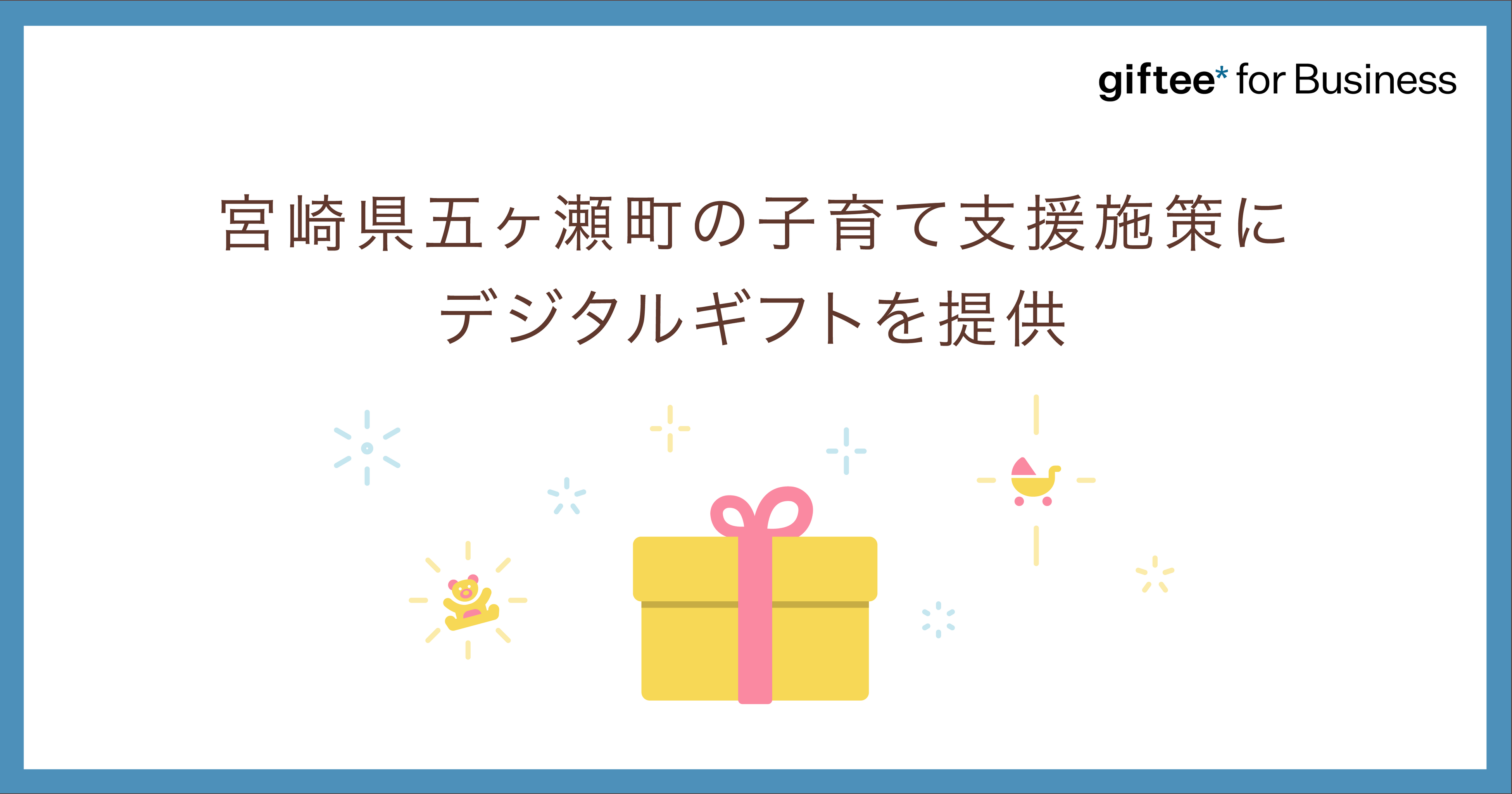eギフトプラットフォーム事業(※1)を展開する株式会社ギフティ(本社:東京都品川区/代表取締役:太田 睦、鈴木 達哉/以下、ギフティ)は、デジタルギフトを活用した法人および自治体向けサービス「giftee for Business」(※2)を、宮崎県五ヶ瀬町が2023年7月28日(金)より開始する令和5年度「五ヶ瀬町出産・子育て応援給付金交付事業」に採択いただきましたのでお知らせいたします。これに伴い、ギフティは本事業の実施に際して、五ヶ瀬町の特性に合わせた施策の企画・設計を手がけ、「giftee for Business」の主力プロダクト「giftee Box®」(※3)を、対象者に給付されるデジタルギフトボックスとして五ヶ瀬町オリジナル仕様にカスタマイズした出産応援ギフト「わくわく赤ちゃんギフト」、子育て応援ギフト「すくすく赤ちゃんギフト」を提供しております。また、確実なギフト給付を実施する手段として、対面でのデジタルギフト付与を効果的かつ効率的に実施するキャンペーンツール「giftee Direct」(※4)を提供いたしましたので、併せてお知らせいたします。