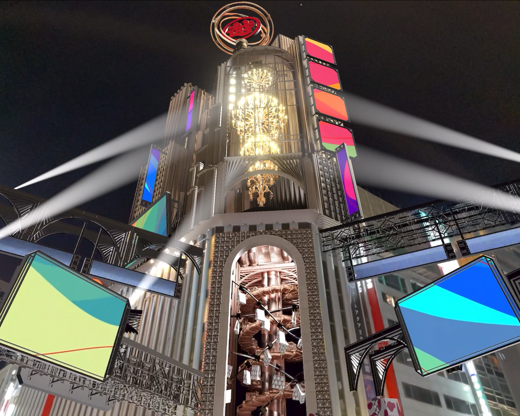 その一環でこのたび、三越銀座店は、国内外の高感度上質なお客様が来街される世界有数の街である銀座4丁目という立地を生かし、その資産である本館の銀座シャンデリアにおいて、グループのインハウスエージェンシーであるスタジオアルタとソニーグループの広告会社であるフロンテッジと協業し、同じくソニーグループのデジタルソリューション提供会社であるSoVeCが開発したXRを活用した広告メディアより新たなエンタテインメントスポットを開発いたしました。