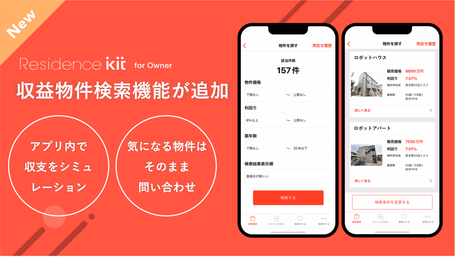 投資用不動産オーナー専用のResidence kit for Ownerアプリに、収益物件検索機能(※)が追加されました。オーナーはアプリ内で収益物件を検索し、購入から運用、売却、再投資まで、全ての工程をアプリひとつで円滑に行うことが可能です。さらに、アプリ内で簡単な入力を行うだけで、不動産投資計画をシミュレーションできる機能も搭載し、投資戦略の最適化にも寄与します。