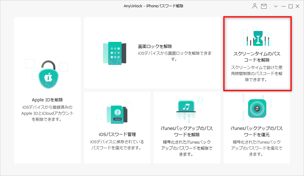 ステップ1、パソコンでAnyUnlockを起動して、画面の「スクリーンタイムのパスコードを解除」をタップしてください。