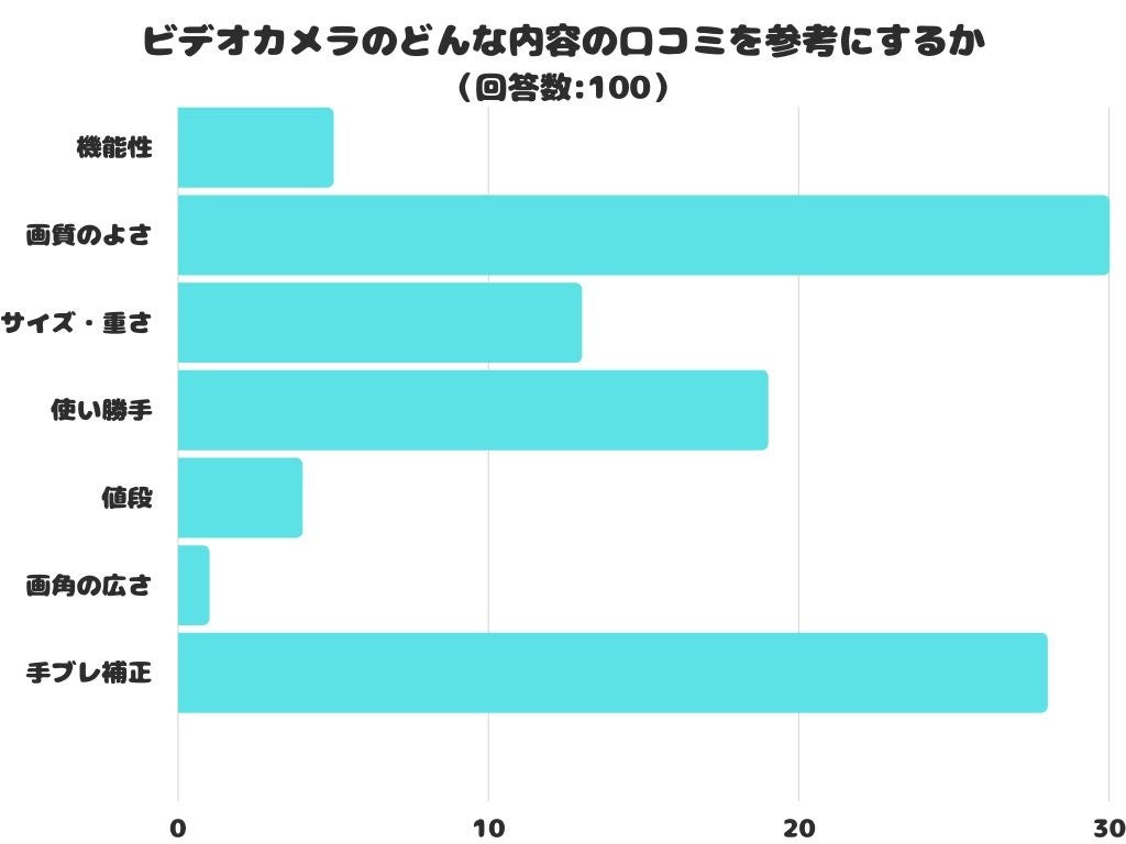 ビデオカメラのどんな内容の口コミを参考にするかをアンケートにて調査したところ、1位は「画質のよさ」でした。