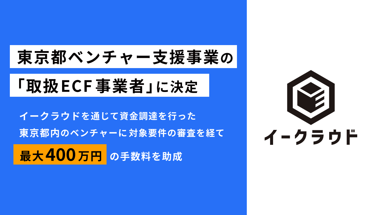 イークラウドはこのたび、同事業の「取扱ECF事業者」に選定されました。これにより、同事業の条件を満たす東京都内のベンチャー企業がイークラウドを通じて資金調達を実施した場合、対象要件の審査を経たうえで、東京都から最大400万円の手数料がベンチャー企業に助成されます。