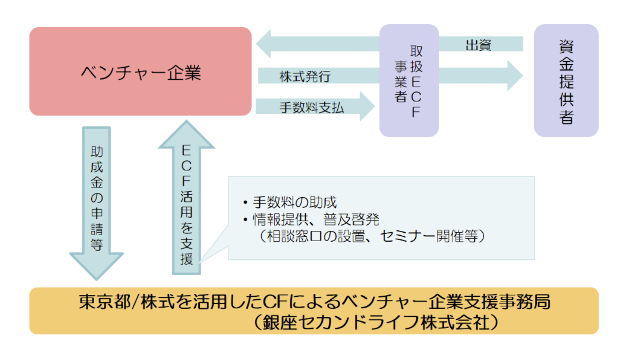 東京都の「株式を活用したクラウドファンディングによるベンチャー企業支援」事業は、ベンチャー企業の株式投資型クラウドファンディング(ECF)の活用を支援することで、新しいビジネスなどへの挑戦を促進するとともに、ベンチャー企業への資金調達手法の多様化に資する株式投資型クラウドファンディングの普及を図ることを目的としています。