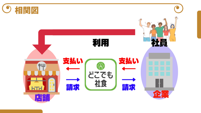 どこでも社⾷は、⾃社に社員⾷堂の設備を持たない企業でも、近くの飲⾷店と提携する事により「社⾷」環境を実現できるサービスです。