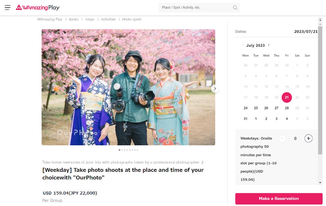 そのような背景から「OurPhoto」は、日本各地で食事や文化など様々な体験を楽しむ、より多くの訪日外国人旅行者の思い出づくりのニーズに応えるため、この度「WAmazing Play」へサービスの掲載を開始いたしました。それにより、訪日外国人旅行者に対するサービス接点を拡大させ、出張撮影のご予約からフォトグラファーとのマッチング、撮影までをよりスムーズに実施できるようになります。予約ページでは英語・台湾語・香港語の3か国語に対応しており、OurPhoto事務局が訪日外国人旅行者の対応が可能なフォトグラファーを、予約リクエストの条件に合わせて選定いたします。