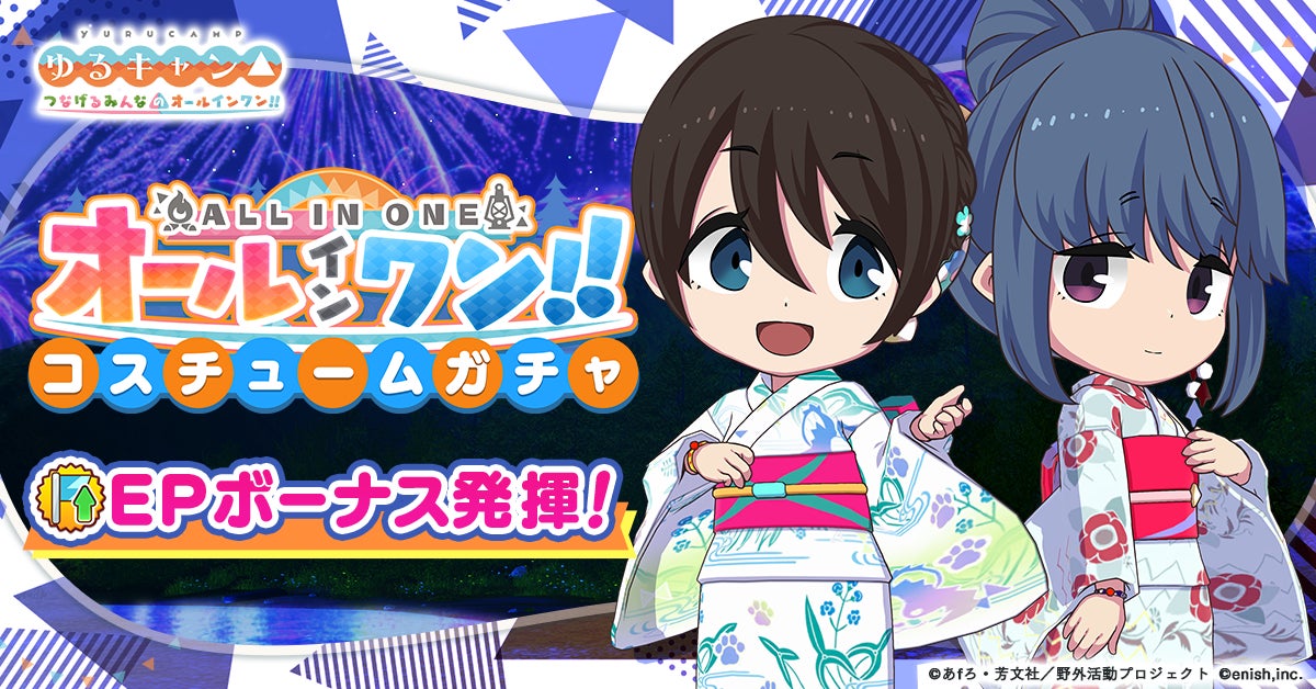 また、イベントに先駆け7月28日(金)より、リンと恵那のゲームオリジナルお祭り浴衣が手に入る【オールインワンコスチュームガチャ】、ゲームオリジナル浴衣キャンプのカードが獲得可能な【つなげる!!サポートカードガチャ】を開始いたしました。