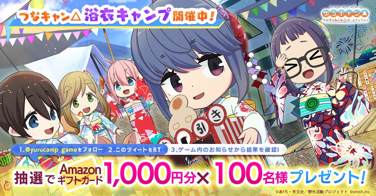 株式会社enish(本社:東京都港区、代表取締役社長:安徳 孝平、以下enish)は、2023年7月29日(土)より、TVアニメ『ゆるキャン△』初となるオンラインゲーム「ゆるキャン△ つなげるみんなのオールインワン!!」にて、ストキャンイベント「浴衣キャンプと夏花火」を開催いたします。