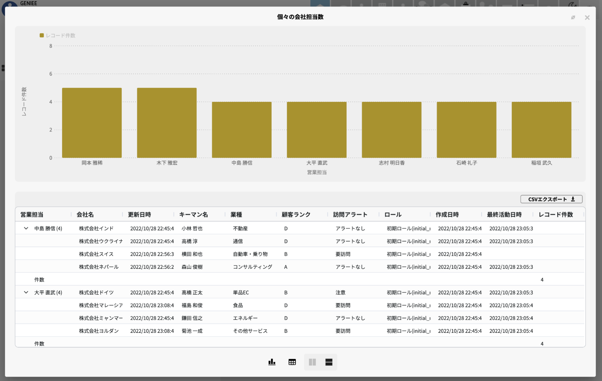 ダッシュボード機能では、「GENIEE SFA/CRM」に蓄積されたデータをグラフや表形式で出力できます。案件や活動進捗がリアルタイムで可視化できるので、会議のための資料作成工数を削減できます。