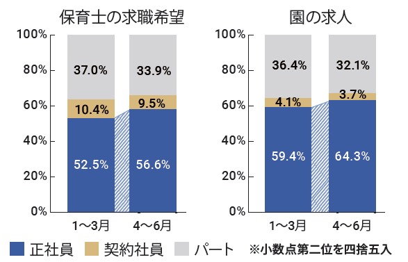 保育士バンク!の利用実績をもとに、直近3か月の保育士求職者の希望と園の募集要件で、正社員・契約社員・パートの雇用形態の割合を算出、 前期間と比較。