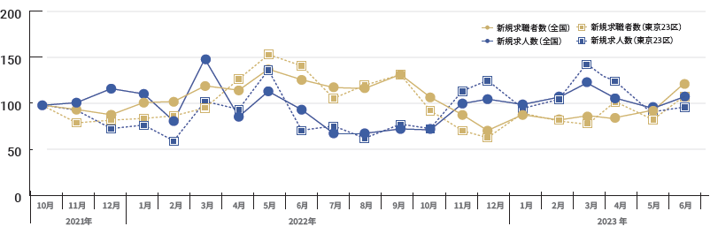 ~ 3つのポイント ~ 1.保育士就職・転職市場において、有料職業紹介を利用している求職者数と求人数の推移を計測。 全国(都内23区も含める)の新規求職者数・新規求人数において、全ての値が上昇しており、保育士転職市場が活発化している。