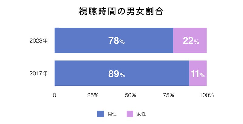 ・チャンネルの視聴時間の中で女性が占める割合は、2017年時点では11%だったが、2023年現在は22%となった