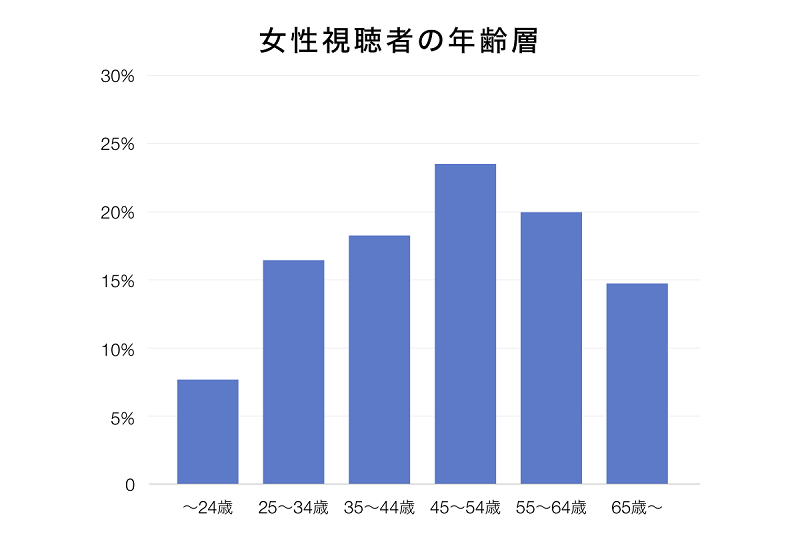 視聴回数における年齢別のデータを見ると、45歳~54歳の人が最も多く23.3%、次いで55歳~64歳の人19.8%、35歳~44歳の人が18.1%と続く。