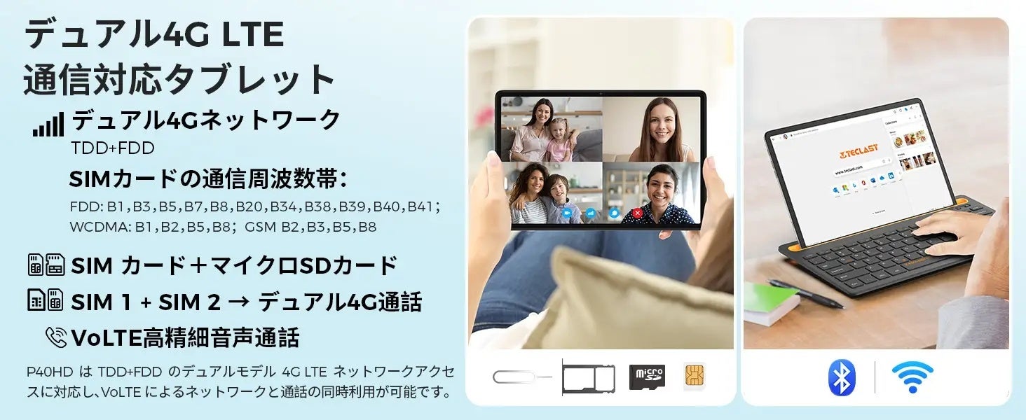 P40HDはTDD+FDDのデュアルモデル4G LTEネットワークアクセスに対応し、VoLTEによるネットワークと通話の同時利用が可能です。デュアルSIMデュアルスタンバイ機能により、仕事とプライベートの切り替えが簡単にできます。802.11ac仕様のデュアルバンドWiFiネットワークに対応し、ネットワークの世界でスッキリ楽しむことができます。Bluetooth 5.0の低消費電力転送により、タブレットの可能性を広げます。