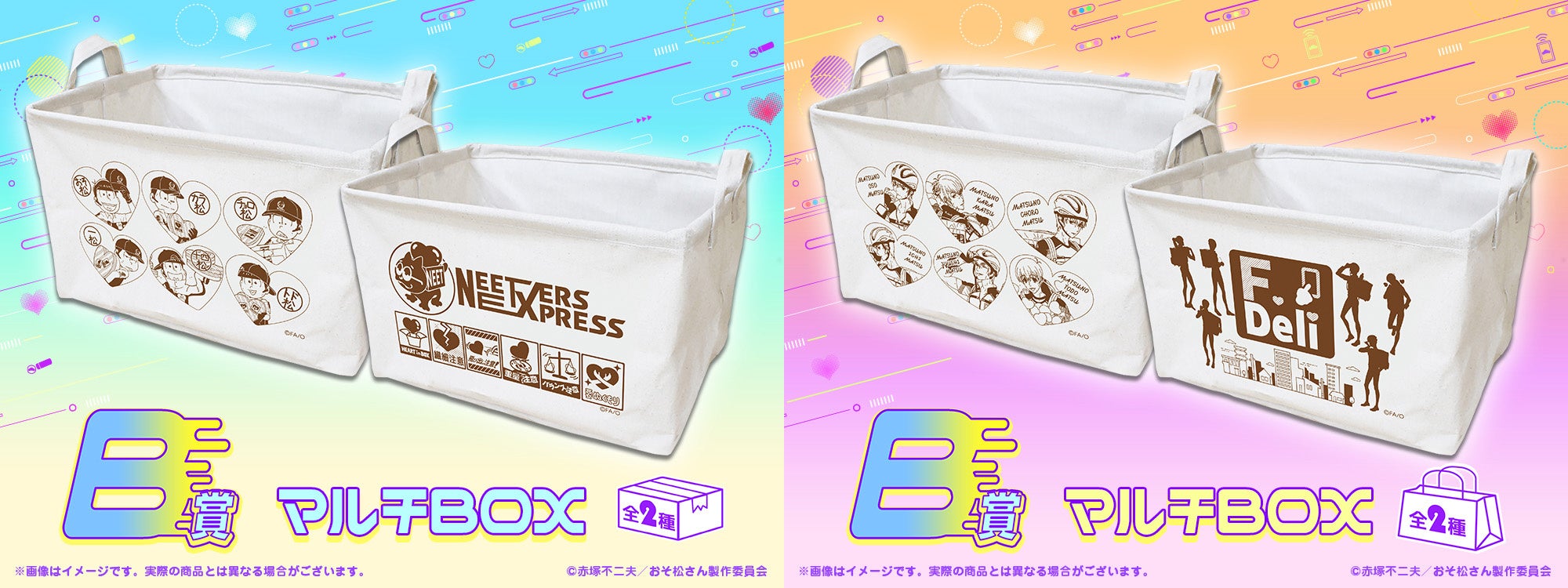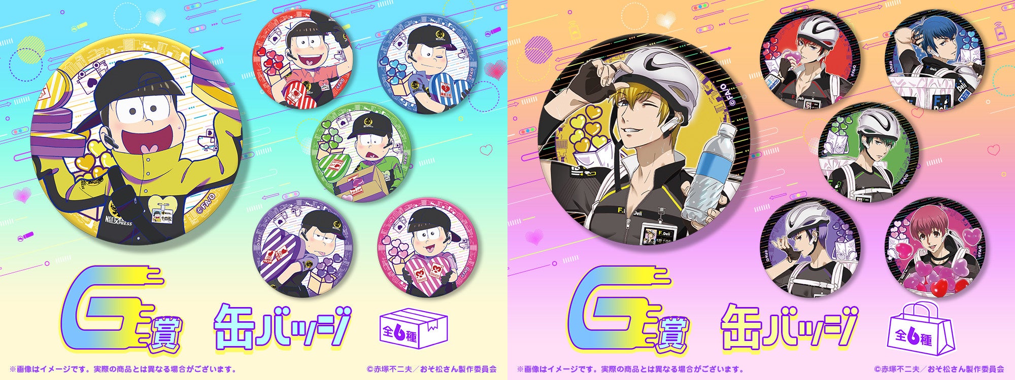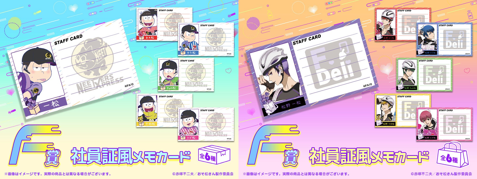運送業者や配達員の黒を基調としたスタイリッシュな制服に身を包んだ6つ子とF6たちが爽やかな汗を流しながら荷物とともにまごころもお届けしてくれるようなイメージのもと、荷物の収納に便利なマルチBOXや小物を入れて持ち運ぶのに便利なエンベロープケース、6つ子とF6の社員証をイメージしたデザインのグッズをラインナップ!