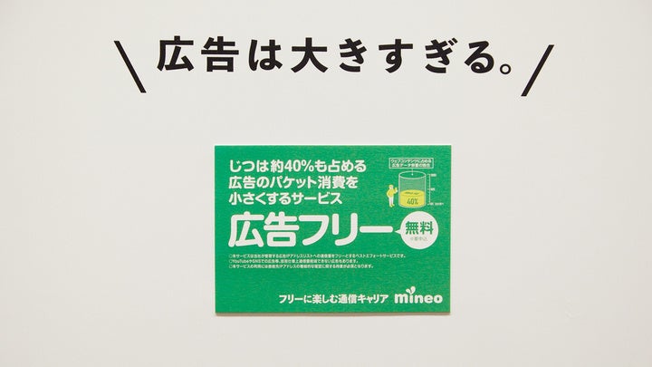 今回受賞した広告は、mineoが2023年3月より開始した、インターネット広告による通信量(パケット)の消費を抑えるサービス「広告フリー」のプロモーションとして実施したものです。具体的には、スマホの利用で消費されるパケットのうち、「インターネット広告の表示によって意図せず消費されるパケットの比率が想像以上に大きい」ということを認知いただきたいと考え企画しました。このメッセージを、大きすぎる広告スペース上で、あえて小さすぎる広告サイズに抑えて掲出することで、パケット消費を小さく抑えられる「広告フリー」の特長をうまく訴求しつつ注目度が高まるよう工夫しました。