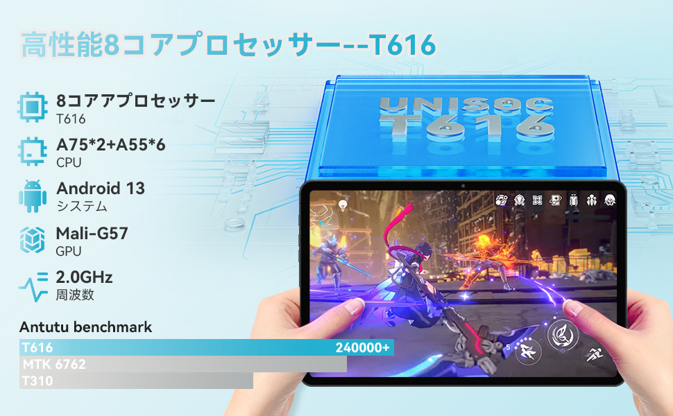 Hpad2 Proは強力なチップTiger T616を採用し、低消費電力の12nmプロセス、2つA75@2.0GHzコア+6つのA55@1.8GHzコアインテリジェントAIチップ、高速計算速度、AnTuTu実行スコアは26万点にも達し、様々な使用シーンに簡単に対応できる。