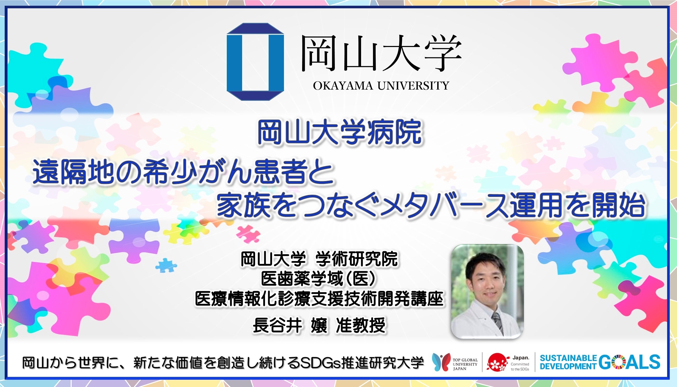 これらの問題を解決するため、岡山大学学術研究院医歯薬学域(医)医療情報化診療支援技術開発講座の長谷井嬢准教授(整形外科)は、2023年6月に遠隔地の患者さんやご家族を繋げるメタバースを開発し、空間の公開を開始しました。現在は、遠隔地の患者さん同士の交流を行うために、全国の拠点病院病院と各診療科との調整を行っており、2023年中には試験運用を開始する予定です。