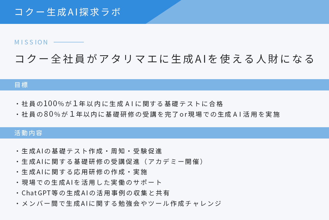 生成AI活用の更なる検証に向けて「コクー生成AI探求ラボ」を発足。スキル向上を図るだけでなく、全社員に対して情報提供を行います。
