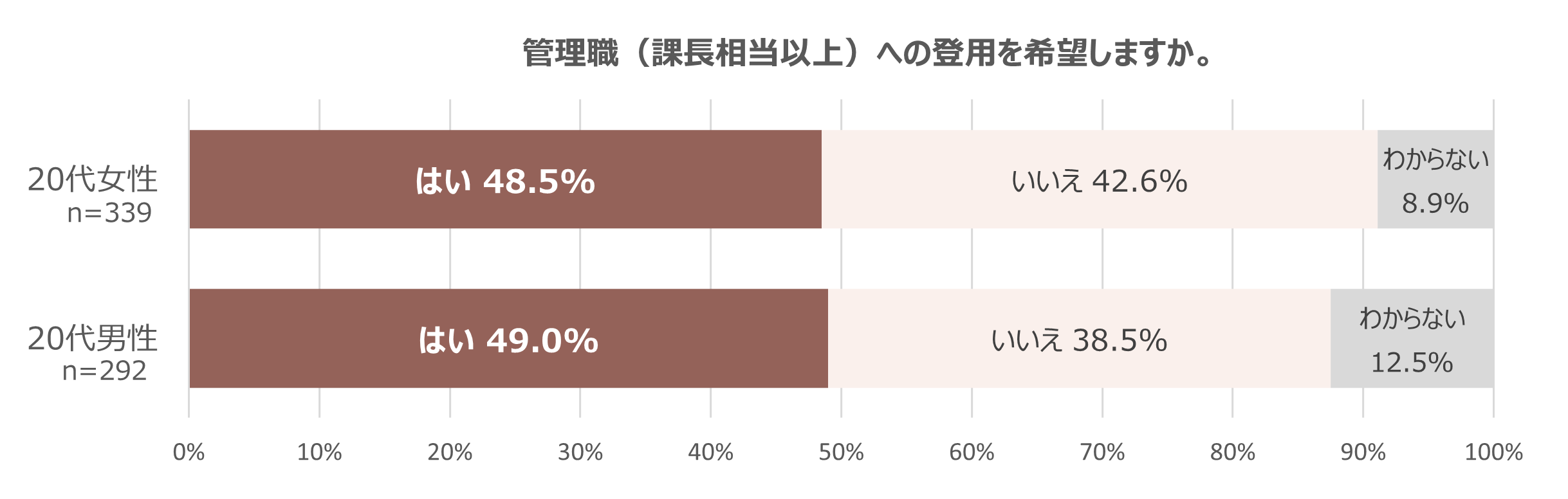 現在管理職でない方の中で、「管理職(課長相当以上)への登用を希望する」と回答した人は22.5%でした。一方で、20代の場合は48.5%が管理職への登用を希望すると回答。20代の男性にも同じ質問をしたところ、希望すると回答したのは49.0%(※)で、男女でほとんど差がないという結果になりました。20代会社員女性の管理職登用へのモチベーションは、同世代の男性とほぼ同水準であることが判明しました。