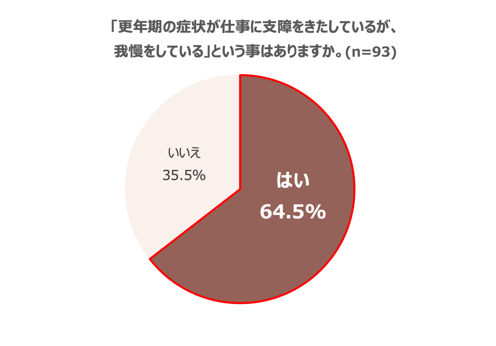 この結果から、40~50代で更年期の症状を抱える女性の多くは、仕事に支障をきたしつつも我慢をしており、仕事のパフォーマンスに影響が出てしまっていることが明らかになりました。