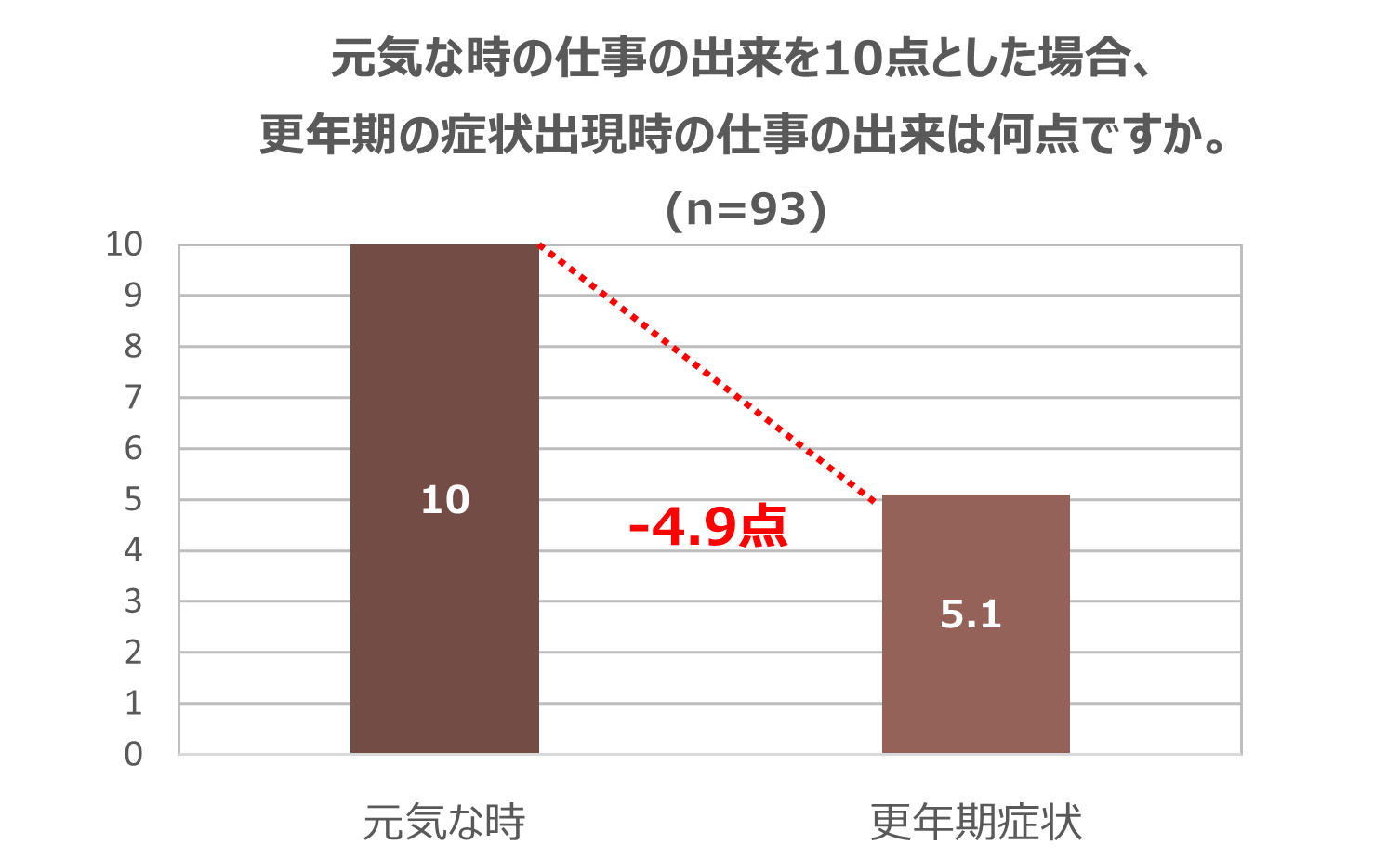 更年期症状に関して、症状を自覚する40~50代女性のうち64.5%が「更年期の症状が仕事に支障をきたしているが、我慢をしている」と回答しました。「元気な時の仕事の出来を10点とした場合、更年期の症状出現時の仕事の出来は何点ですか」という質問の回答は平均5.1点で、更年期症状の影響により、4.9点分も仕事のパフォーマンスが下がるということが判明しました。